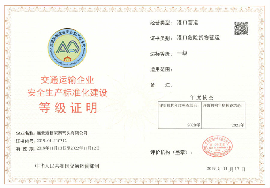 为进一步加强对公司安全生产工作的管理,落实安全生产主体责任,建立长期有效安全生产机制,在公司各部门的精心准备及全力配合下,新荣泰码头公司近日取得交通运输部颁发的交通运输企业安全生产标准化建设一级达标证书。