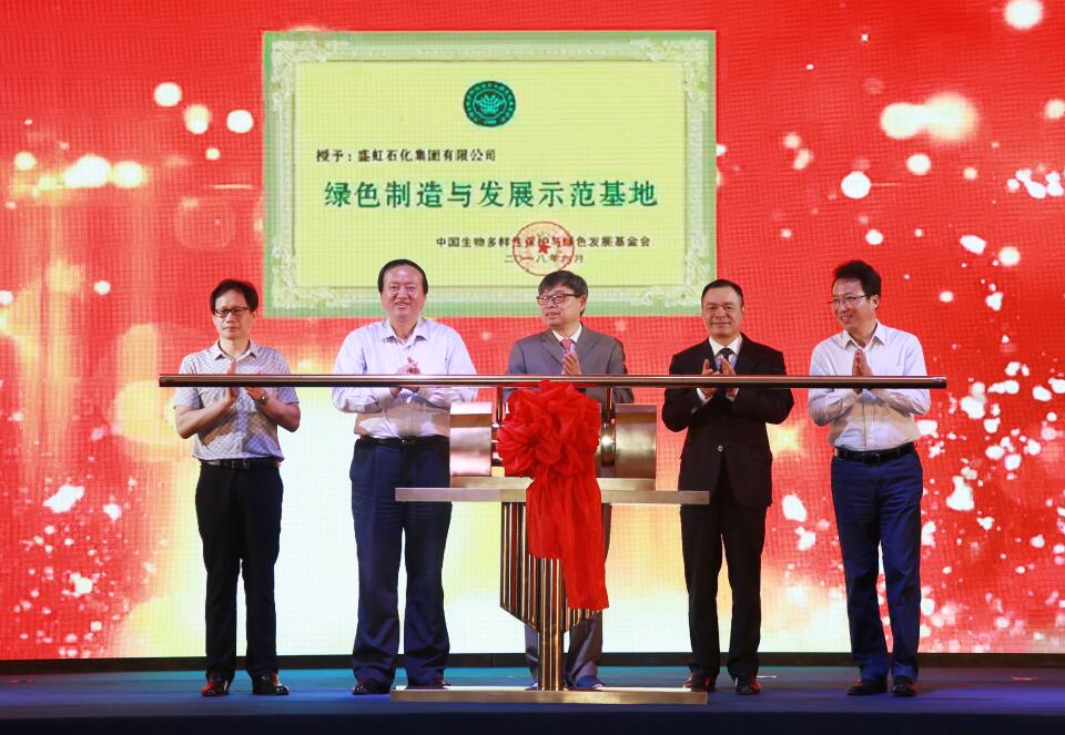 大会上,盛虹石化集团被授予“绿色制造与发展示范基地”,国务院参事谢伯阳、连云港市人民政府副市长徐家保、中国绿色发展联盟秘书长郭府青、连云港市经信委主任吕洁和集团董事长缪汉根先生共同为基地揭牌。