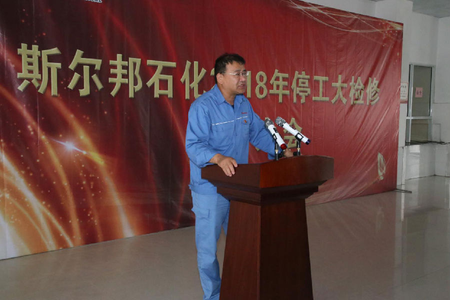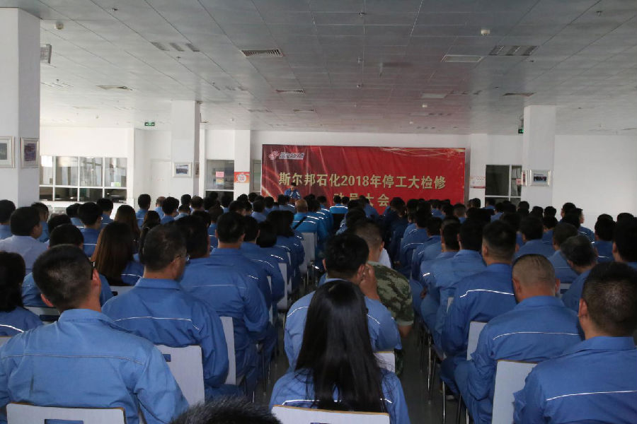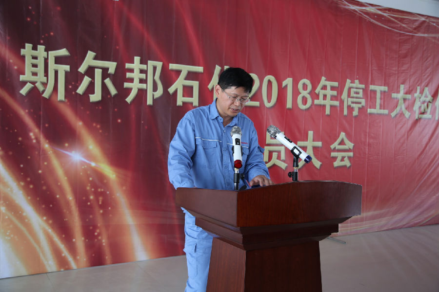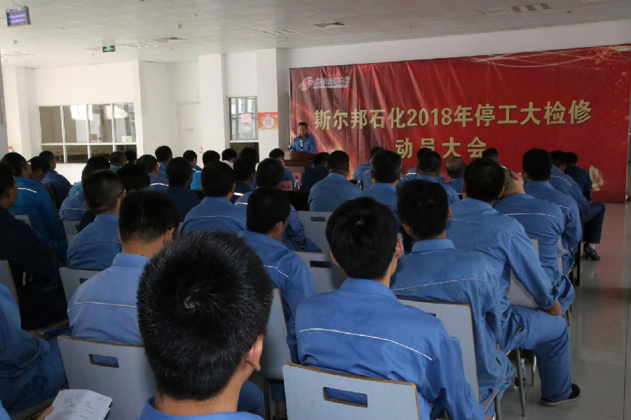会议由斯尔邦石化安全总监郭榜立主持,斯尔邦石化设备副总经理杨瑞平首先作检修动员报告,介绍了大检修的总体情况、任务总量和整体目标,确立“安全、环保、优质、高效、科学、有序”的检修方针,以及“零事故、零环保、零伤害”的安全环保目标,重点强调了检修过程中的安全环保管理与监督、检修质量管理及检修进度管理等要求。