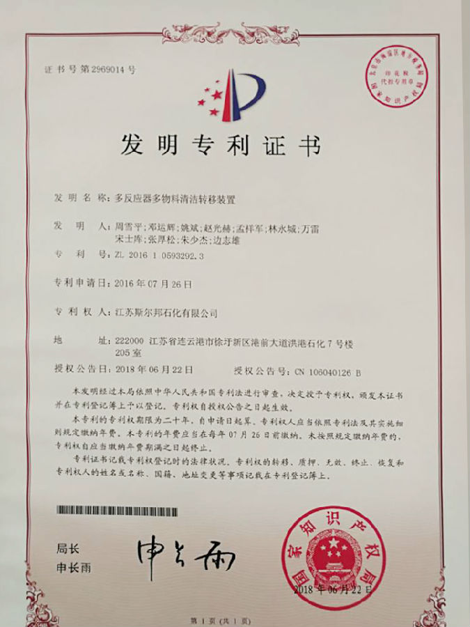 近日,斯尔邦石化收到国家知识产权局寄来的发明专利证书,EO事业部2016年提报的发明专利“多反应器多物料清洁转移装置”喜获认定通过,这是斯尔邦石化获得的第一项发明专利。