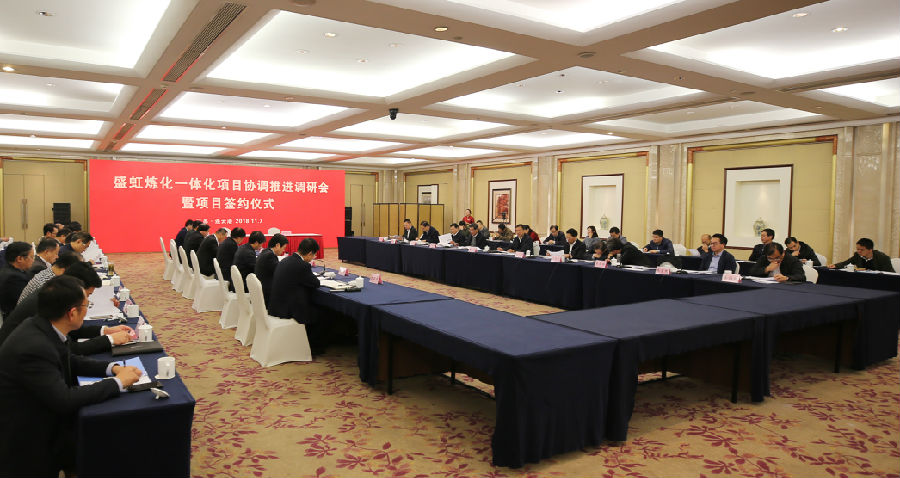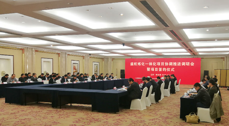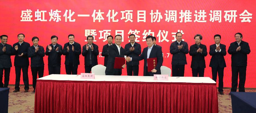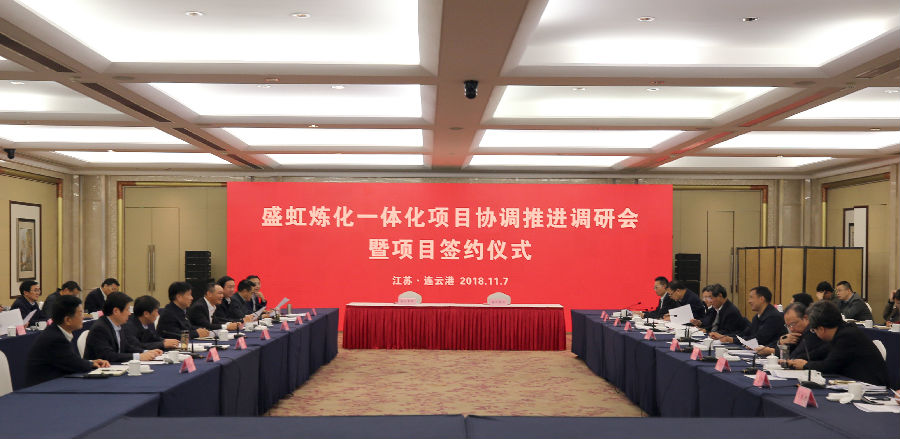 11月7日,盛虹炼化一体化项目协调推进调研会暨项目签约仪式在连云港市举行。省委常委、常务副省长、省委秘书长樊金龙主持会议,省发展改革委、省工业和信息化厅、省自然资源厅、省生态环境厅、省商务厅、省应急管理厅、省能源局和连云港市、徐圩新区主要领导参加会议,董事长缪汉根汇报盛虹集团发展情况以及炼化一体化项目实施计划。