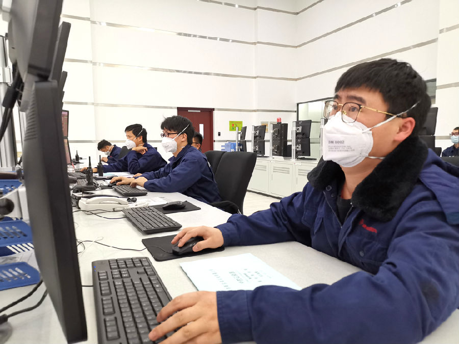 2月8日,江苏省连云港石化产业基地内,在江苏斯尔邦石化有限公司中央控制室的屏幕上,各个生产装置的数据一览无遗,这些装置正开足马力,满负荷稳定运行。公司总经理白玮表示,由于节前针对疫情制定了比较合理的生产计划,公司生产所需原料和在岗人员都比较充足。“目前,斯尔邦石化共有1500余名员工坚守一线。”白玮说。